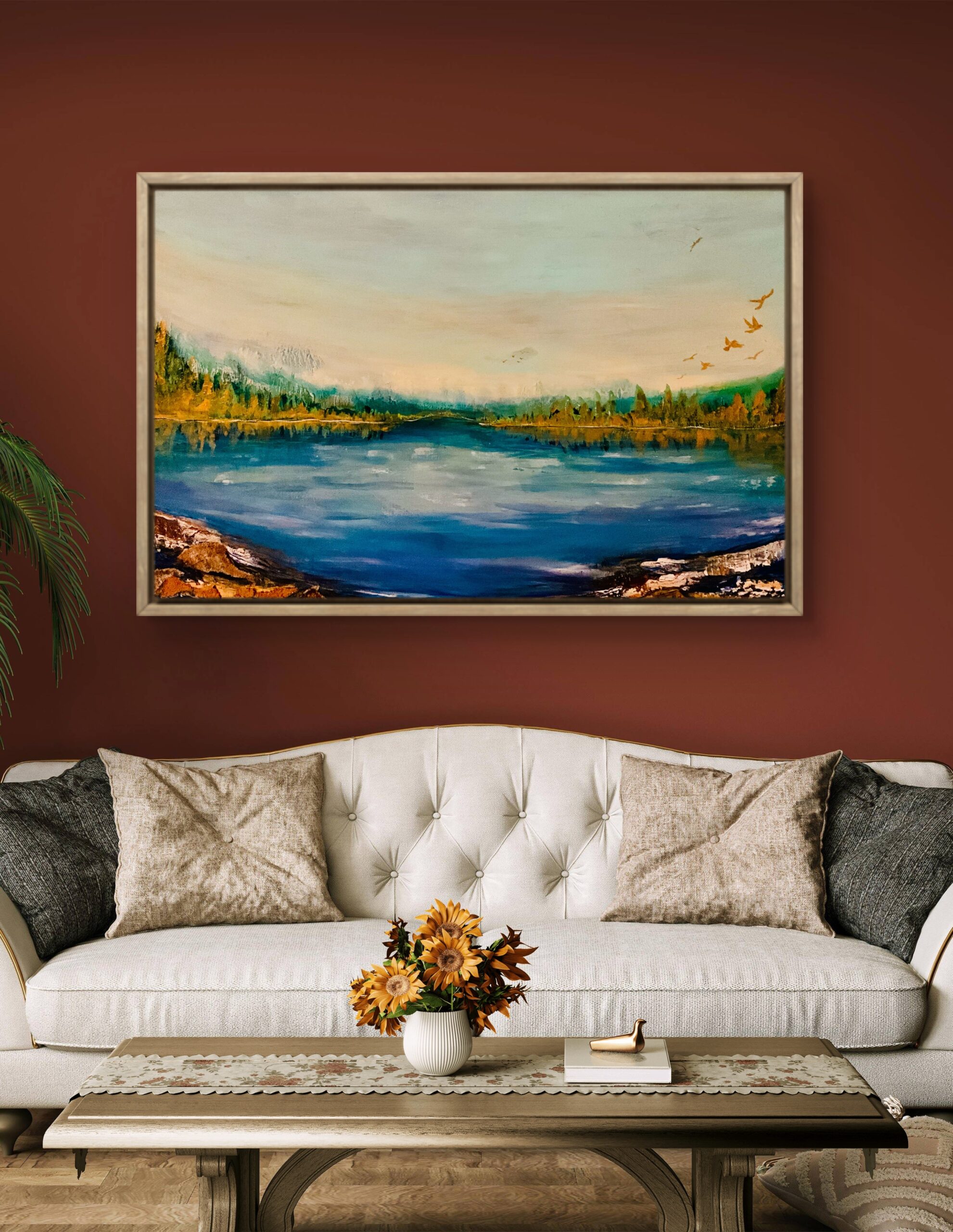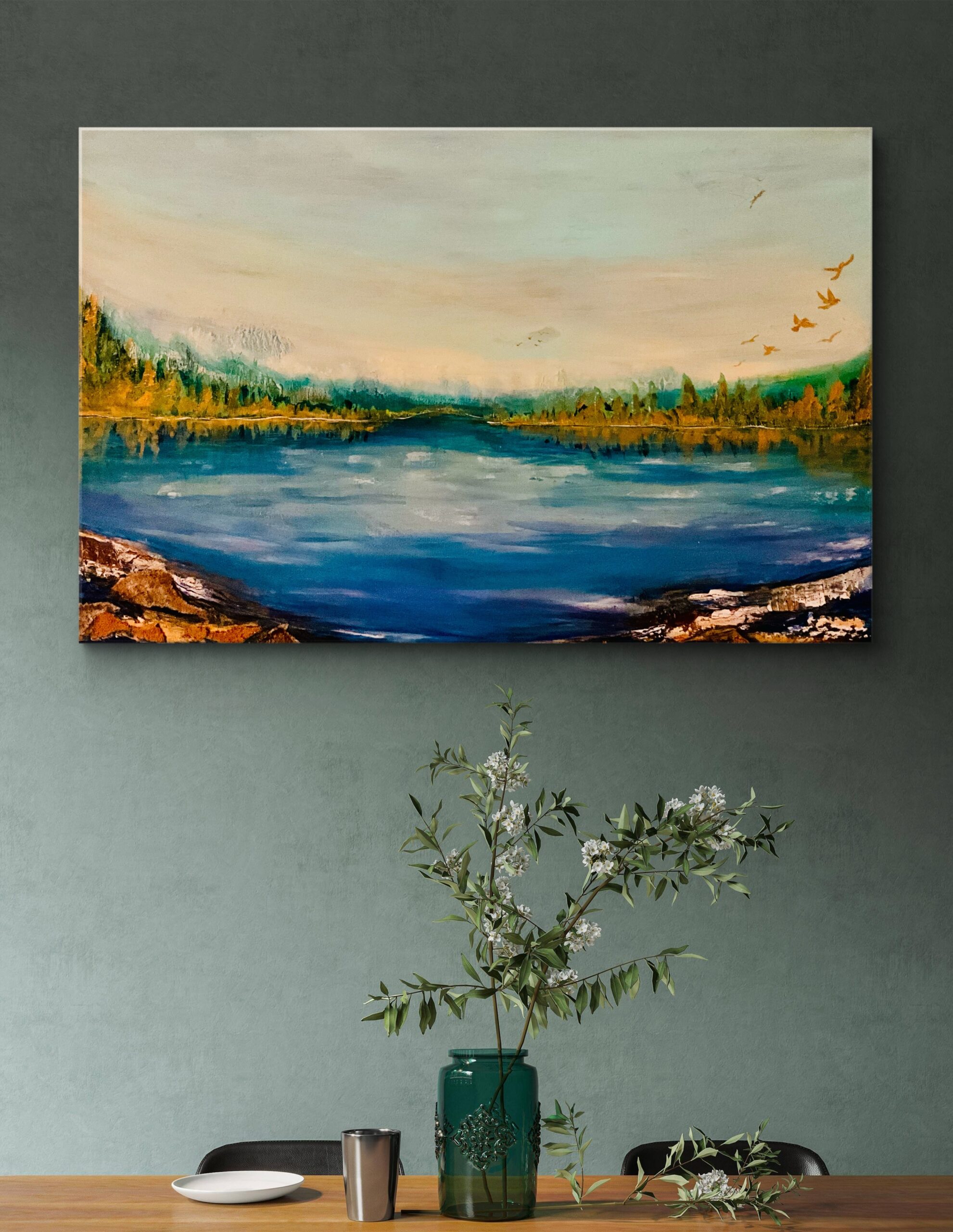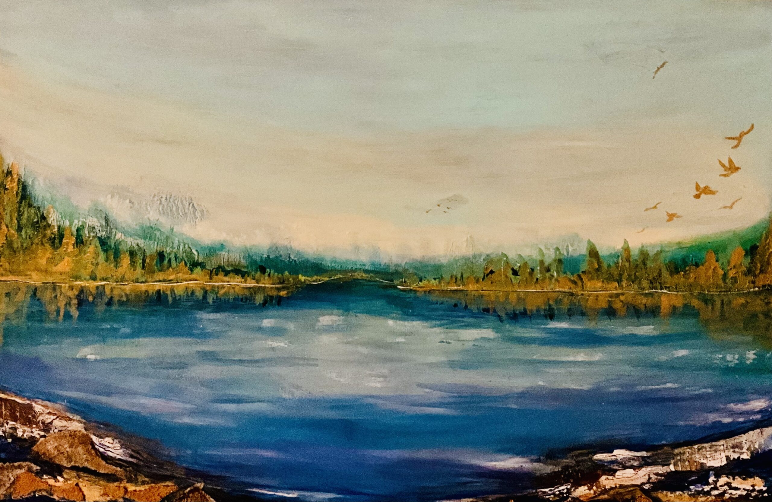 This painting is inspired by the ever-changing views from my home. Every single day, the landscape transforms before my eyes, and I wanted to capture its essence in abstract form. When I close my eyes, this is the image that appears — a serene blend of golden trees and a tranquil blue sea that calms my soul. It’s more than a painting; it’s my artistic sanctuary.